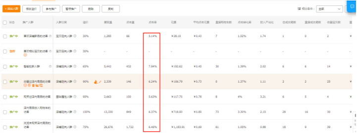 淘宝代运营根据产品背后的买家人群在直通车自定义人群里面去测试匹配,具体根据性别+年龄段+类目笔单价分层设置、两两匹配,比如18-24岁为一组人群标签,25-29岁为一组人群标签,测试,其次其他人群均衡选择溢价测试。人群测试3-5天后,对于展现少、点击量一般的人群适当提高溢价;转化好、收藏加购高的人群提高溢价;无转化、提高溢价后无展现的人群暂停即可。