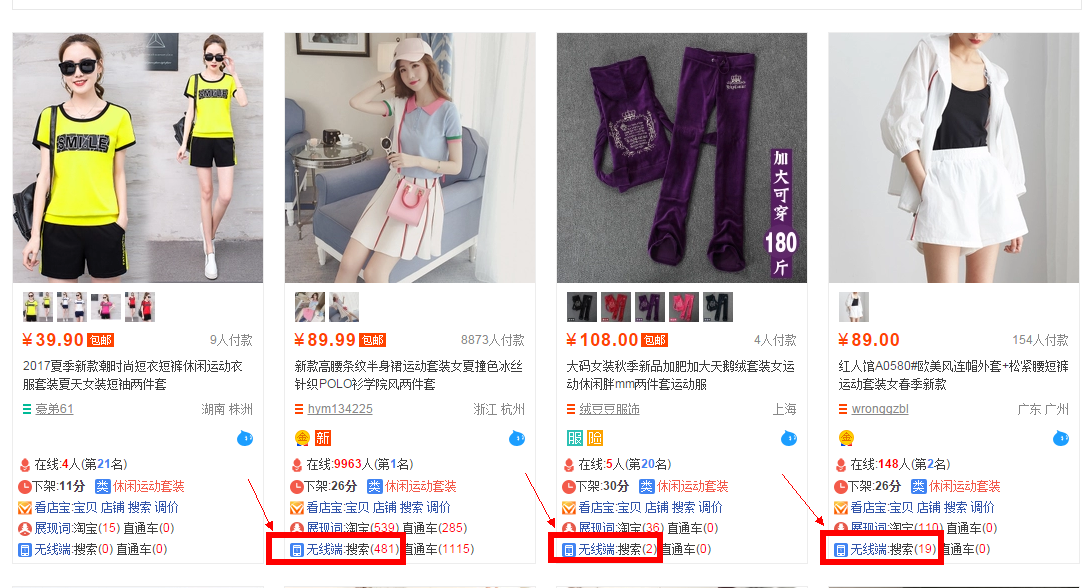 二 通过上面的搜索词查找规律和搜索人气最高的词记录下来。关键词本身包含搜索人气和转化率1.花钱方法:生意参谋里面市场行情查看自己关键词是否都有高的搜索人气和转化。2.免费方法:店侦探查看有销量的同行无线端搜索词,记录排名高的词。多找几个同行进行记录。三 与宝贝匹配度高和精准这里我拿个例子来说下,这里有两个不同的店铺做个同类产品,价格都是一样的,而两个分别是这个页面的第一和第二名,第一的已经一千多销量第二名几百销量,但是重点我也框出来了,一个完全靠直通车推的,一个靠自然搜索做的。为什么把他们放在一起,因为这两个店铺,同样的客单价,销量高的标题做的没第二个好销量低的好,因为它的标题是包含条纹和冰丝,而我在主图里看不出这两个属性。而第二个宝贝标题是连帽外套和松紧短裤非常符合主图。